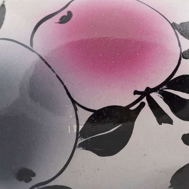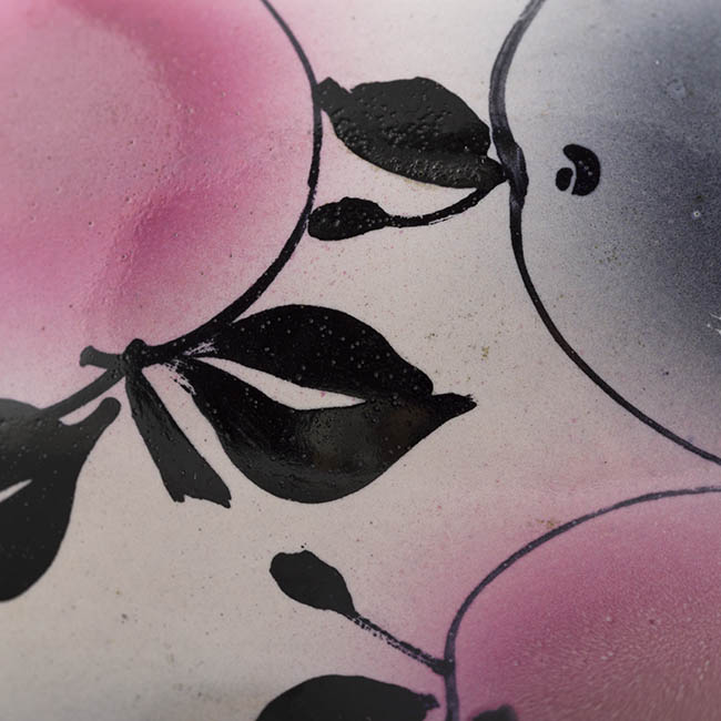 Contenedor destinado a servir líquidos, compuesto por un cuerpo globular bajo, un asa lateral y un cuello corto con tapa. La superficie presenta un fondo beige sobre el cual se disponen figuras fitomorfas en tonos rosados, acompañadas de hojas negras.