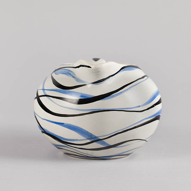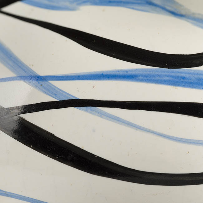 La superficie exterior está recubierta por un esmalte blanco, sobre el cual se disponen líneas onduladas continuas en tonos azul y negro. Estas líneas se superponen y cruzan de forma irregular.