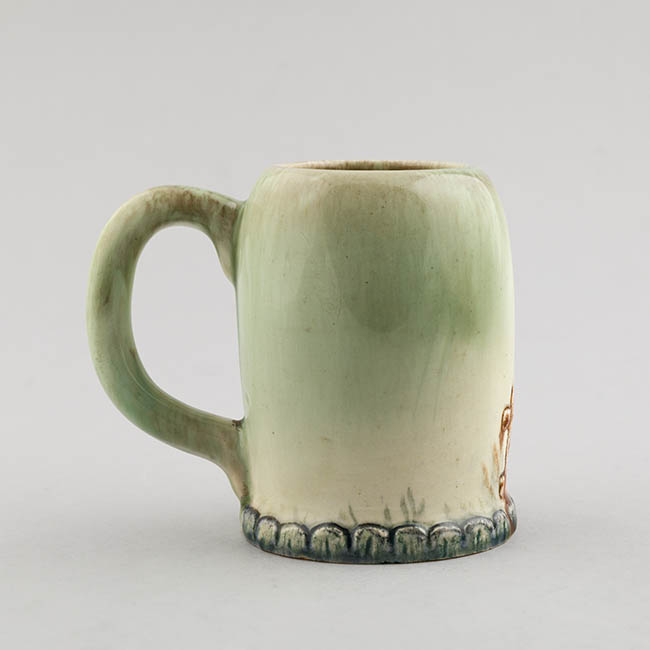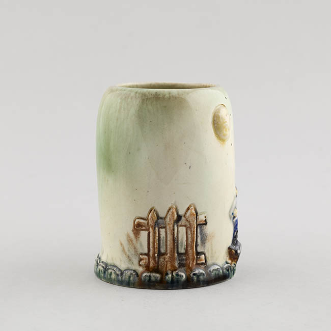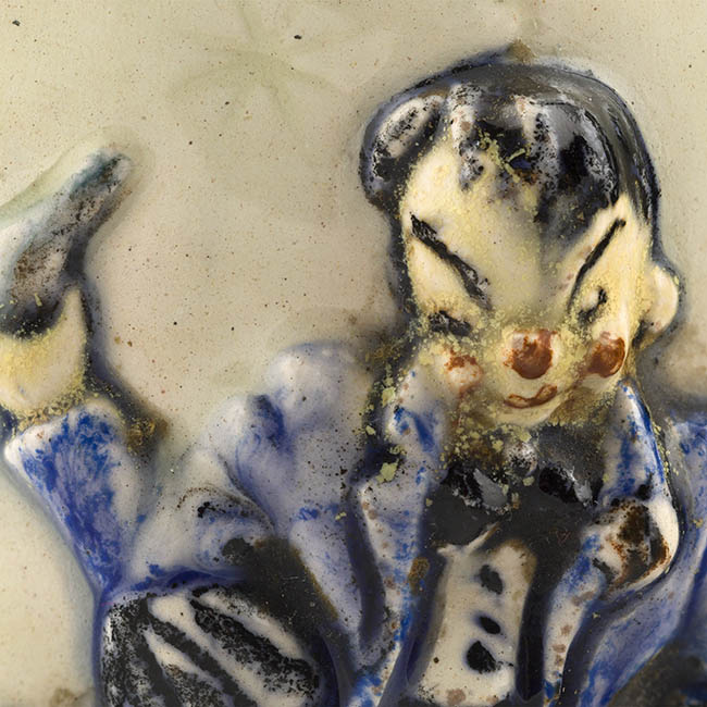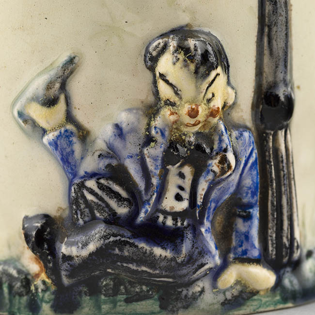 Contenedor de cuerpo cilíndrico con base plana y asa lateral de sección curva. La boca es amplia y de borde ligeramente engrosado. La superficie presenta un esmaltado claro de tonalidad marfil con aplicaciones decorativas en relieve. En uno de los laterales se distinguen figuras modeladas en bajo relieve, representando formas orgánicas y figurativas de carácter esquemático, en tonos oscuros y azulados. El interior presenta un esmalte uniforme de tonalidad beige clara.