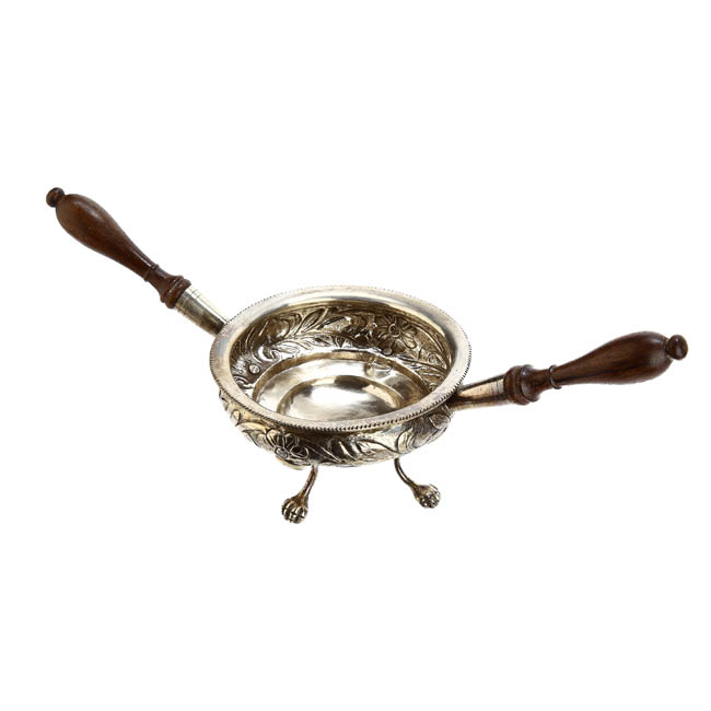 Recipiente para contener brasas y poner de sobremesa para quemar hierbas aromáticas o encender pipa/cigarros. Tiene cuerpo globular bajo, de boca ancha circular con mangos laterales de madera torneada. Se apoya sobre 4 patas que terminan en garras. La decoración del cuerpo es de formas vegetales, flores y ramas.