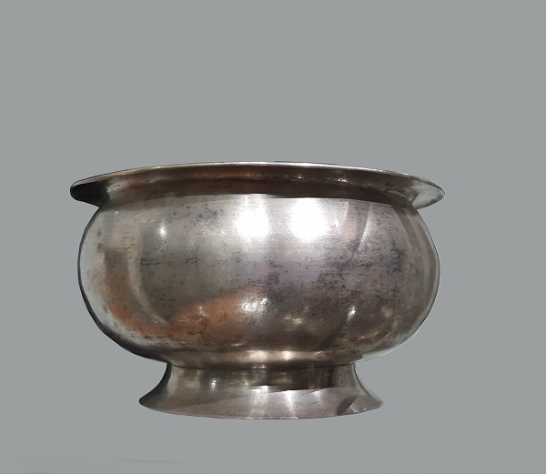 Objeto de uso doméstico. Recipiente realizado en plata batida a martillo y bruñida, tiene forma globular con borde ancho y plano en el borde. Tiene un asa lateral de forma curva. Se eleva sobre un pequeño zócalo circular.