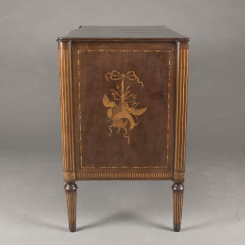 Mueble de almacenaje, de cuerpo rectangular, tres cajones y ángulos laterales formado por columnas; elevado sobre cuatro patas estilizadas de cono torneado y estriado. Decoración, marquetería enmarca tiradores y bocallaves, con cintas y guirnaldas; tableros laterales y superior con diseños alusivos a la cacería e instrumentos musicales.