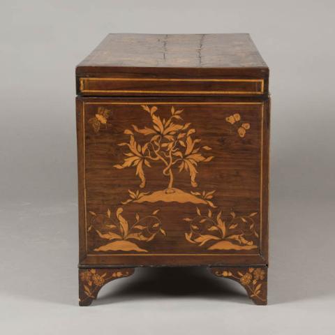 Mueble de almacenaje, de forma rectangular, el panel superior es una tapa abatible con bisagras, al interior en los extremos presenta divisiones. Tiene cuatro patas de esquina recta y perfil interno escalonado. Decoración en marquetería de inspiración indo-chinesca con árboles, frutos, plantas y flores; mariposas, alces, loros, garzas, y elefantes además de una composición alegórica a la música, representado por violines, trompetas y partituras. Los costados están decorados con grandes jarrones con flores y en la parte inferior dos elefantes. Tiene tirador en la tapa con cabeza de león y bocallave con aves en metal.