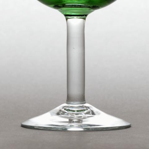 Objeto de uso doméstico, contenedor de líquidos, copa de vino. Cuenco de forma cilíndrica con base redonda, de boca circular y extremo inferior más amplio y de color más intenso en la base. De color verde. El fuste es alto, cilíndrico y presenta un anillo en unión con el cuenco. Se eleva sobre un pie, circular de relieve cónico.