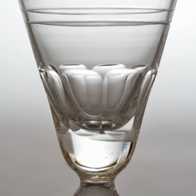 Copa de licor, transparente. Presenta el cuenco en forma de embudo, de boca circular amplia y volumen restringido en la base, ésta es de forma aguda. El fuste es breve, presenta una gran esfera central y se eleva sobre un pie circular amplio, de relieve cónico. Presenta decoración geométrica tallada en la zona alta del cuenco, dos líneas paralelas y en la base exhibe un patrón acanalado, en forma longitudinal.