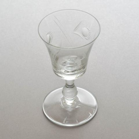 Copa de vino, transparente. El cuenco es campaniforme, de extremo superior amplio, boca circular, zona inferior restringida y base recortada. El fuste tiene forma de balaustre, en la base lleva un pequeño zócalo circular que lo adhiere al pie, también circular y plano de relieve afaldillado. El cuenco presenta decoración en diseño geométrico , estructurada sobre delgadas líneas diagonales, círculos y conjuntos de formas elípticas.