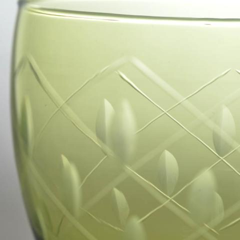Copa de vino blanco. El cuenco es globular, al extremo superior recortado, boca circular y amplia; zona media alta abombada y la base es restringida, maciza. El cuenco es de color verde, más intenso en la base. El fuste es alto y cilíndrico. Pie circular de relieve cónico sencillo. El cuenco presenta decoración geométrica tallada, el diseño es un amplio patrón de líneas diagonales, delgadas que forman rombos y una forma elíptica de extremos agudos en el centro.