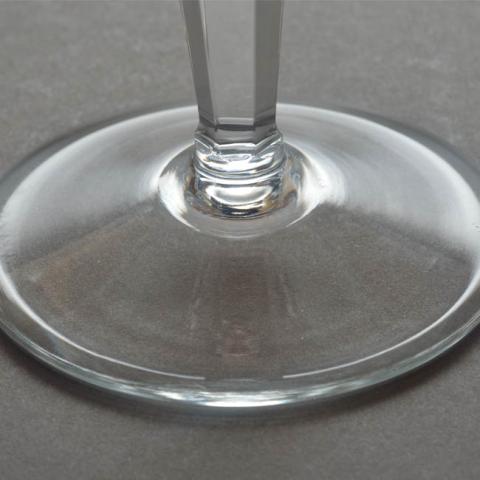 Copa de vino blanco. El cuenco es campaniforme, extremo superior amplio, boca circular, borde evergente; base restringida, en donde presenta un color damasco. Desde la base del cuenco se prolonga el fuste, en forma de pedestal, de mayores dimensiones junto al cuenco y de forma aguda en la unión con el pie, los bordes son recortados en secciones. El pie es circular de relieve cónico. Presenta decoración tallada geométrica, ubicada en la base del cuenco y el fuste, un diseño en facetas de formas elípticas y rectas en el fuste.