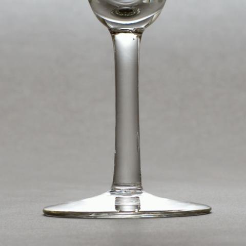 Objeto de uso doméstico, es una copa de aperitivo. Cuenco en forma de embudo; amplio en el extremo superior con paredes que convergen en la base de menores dimensiones. Fuste cilíndrico, alto y transparente. Se eleva sobre un pie circular de relieve cónico. Decoración de esmalte que consiste en cuatro finas líneas de oro y entre estas, una franja de color rosado tallado posteriormente con formas agudas.