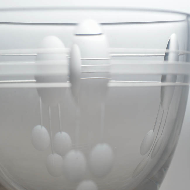 Copa de licor, transparente. El cuenco presenta forma ojival, de extremo superior recortado, boca circular, amplia; el volumen restringido, en la base converge en una forma apuntada. El fuste es cilíndrico y uniforme; este descansa sobre el pie, circular y de relieve levemente cónico. El cuenco presenta decoración geométrica tallada, ubicada en la zona alta; con dos líneas delgadas y un patrón formado por elipses, con tres de éstas que penden a manera de racimo.