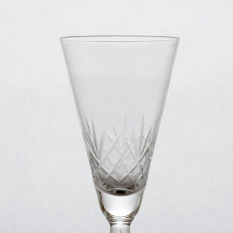 Copa de champan, transparente. El cuenco tiene forma de embudo, la boca es circular, amplia y el extremo inferior es agudo. El fuste es alto, cilíndrico y se eleva sobre un pie de forma circular, de relieve plano tipo afaldillado. El cuenco presenta decoración geométrica tallada en la base, estructurada sobre un patrón líneas diagonales que se cruzan y forman rombos y sobre estos tres formas agudas, unidas en el vértice y líneas divergentes .