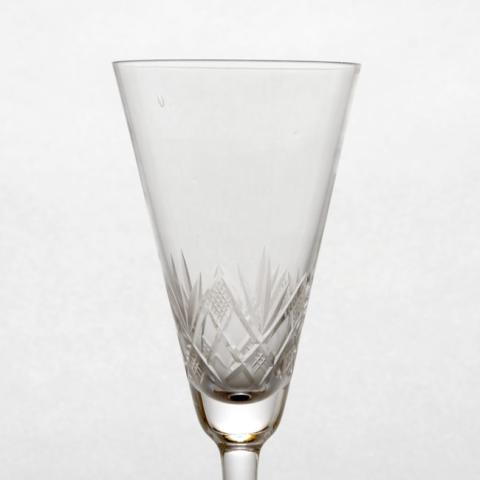 Copa de champan, transparente. El cuenco tiene forma de embudo, la boca es circular, amplia y el extremo inferior es agudo. El fuste es alto, cilíndrico y se eleva sobre un pie de forma circular, de relieve plano tipo afaldillado. El cuenco presenta en la base decoración geométrica tallada, estructurada sobre un patrón líneas diagonales que se cruzan y forman rombos, sobre estos se prolongan tres formas agudas, de líneas divergentes, unidas en el vértice .