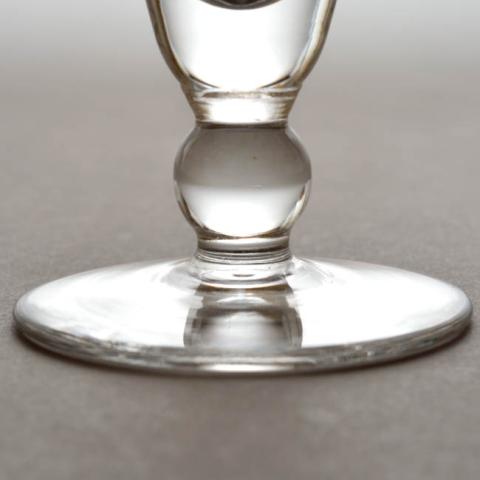 Copa de fuste bajo. El cuenco tiene forma de embudo, de boca amplia y volumen restringido en el extremo inferior, la base es reducida, aguda y maciza. El fuste es breve, formado por una importante esfera central y se eleva sobre un pie circular amplio, de forma cónica. Presenta decoración geométrica tallada en la zona alta del cuenco, el diseño es un patrón simétrico con un elemento formado por un eje y sobre este, siete formas lanceoladas y divergentes, entre la base lleva un circulo y forman una franja.
