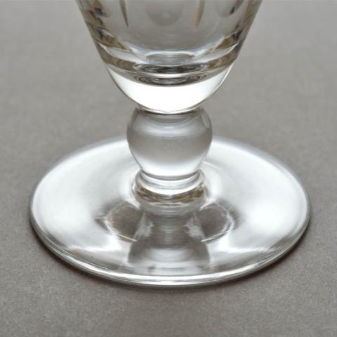 Copa de fuste bajo, transparente. El cuenco tiene forma de embudo, de boca amplia y volumen restringido en el extremo inferior, la base es reducida, aguda y maciza. El fuste es breve, formado por una importante esfera central y se eleva sobre un pie circular amplio, de forma cónica. Presenta decoración geométrica tallada en la zona alta del cuenco, el diseño es un patrón simétrico con un elemento formado por un eje y sobre este, siete formas lanceoladas y divergentes, entre la base lleva un circulo y forman una franja.