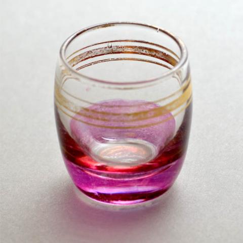 Objeto de uso doméstico, contenedor de líquidos, vaso de licor. De forma cilíndrica, boca circular, de volumen convexo en la zona media y restringido en el extremo inferior; presenta una base breve, circular y plana. Tiene decoración esmaltada y aplicación de dorado, en tres finas líneas perimetrales ubicadas en la zona alta y borde de la boca.