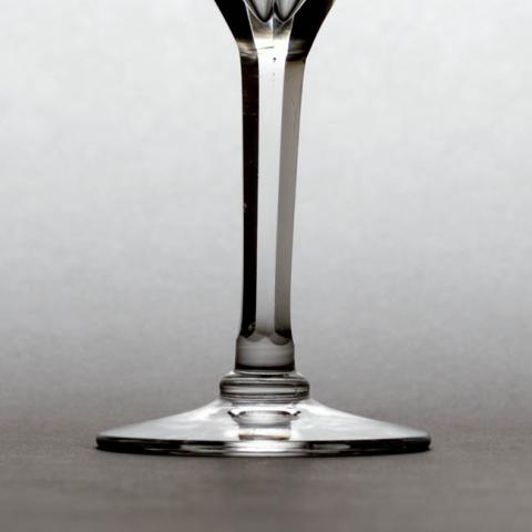 Contenedor de vino, presenta el cuenco en forma de embudo; el extremo superior es amplio tiene boca circular y paredes restringidas en la base; ésta se prolonga un delgado fuste, cilíndrico que termina en forma aguda. El pie es circular y breve. Presenta decoración geométrica tallada en la base del cuenco, con facetas en forma oval.