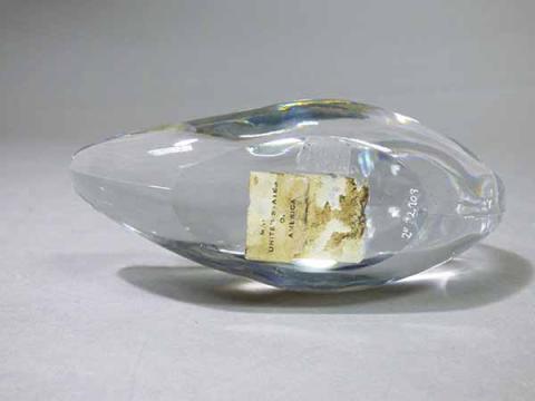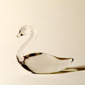 Objeto decorativo, representación de un ave, cisne transparente. De cabeza pequeña, pende de un cuello alto en curva, el cuerpo es una elipse prolongado en una pequeña cola. Extremo inferior ovalado y plano.