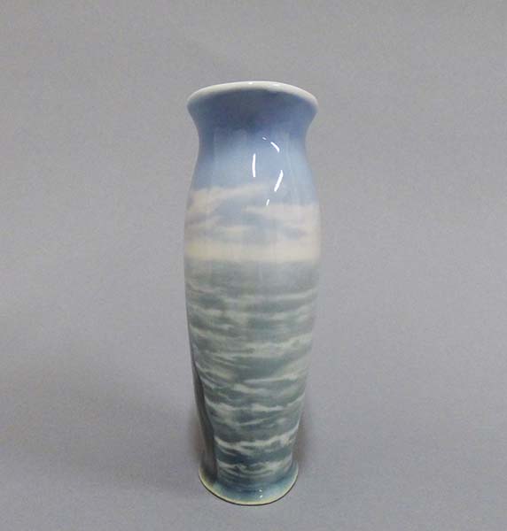 Objeto de uso doméstico y decorativo. Contenedor de pequeñas dimensiones alto y ovalado. Boca ovalada de borde evertido, y cuerpo de forma elíptica de paredes restringidas hacia la base, con un pequeño zócalo elíptico. Presenta decoración de un paisaje marino: sobre unas rocas en un risco descansan dos gaviotas de aspecto naturalista, con el mar de fondo; resuelto en tonos celestes y grises.