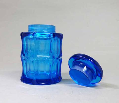 Recipiente cilíndrico de color azul; extremo superior presenta tapadera escalonada y prominente. El cuerpo persenta la superficie tallada en doble corrida de óvalos. Base circular plana.