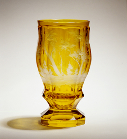 Contenedor decorativo de uso doméstico, utilizado para poner flores. De forma cilíndrica, de boca amplia, el cuerpo en la zona media presenta leve abultamiento que decrece hacia la base. Se presentan en diez facetas longitudinales. Al extremo inferior tiene una moldura y las paredes restringidas; se eleva sobre un pie circular de superficie en cortes geométricos. De color ámbar, con decoración tallada de paisajes con árboles, ciervos y aves.