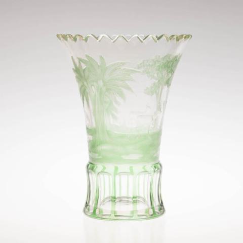 De color transparente y verde. Decoración tallada en el cuerpo, en color verde, representando árboles y animales. Junto a la base presenta una sucesión de óvalos.