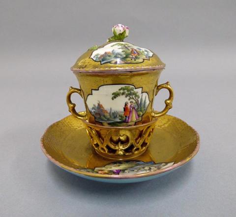 Conjunto formado por una taza con tapa y platillo, de color dorado con cartelas blancas dentro de las cuales están pintados paisajes y escenas galantes. La tapa es cóncava, lleva un tomador central en forma de flor y con decoraciones a cada lado. La taza es de boca amplia, y paredes altas, tiene dos asas, una a cada lado. Se apoya sobre un platillo que tiene una rejilla elevada en el centro donde se encaja la taza de base mas restringida para evitar que ésta se vuelque.