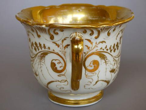 Taza para tomar el té de estilo Rococó. Realizada en porcelana de pasta dura con filigrana en dorado de elementos vegetales en relieve formando un cartouche con vistas de la ex colonia alemana en el siglo XIX Gnadenfeld, actualmente perteneciente territorio ucraniano. El interior es blanco con círculo delgado dorado en el fondo y llegando al borde, una franja ancha dorada. El plato es blanco también con filigrana dorada imitando formas vegetales de zarcillos y hojas.