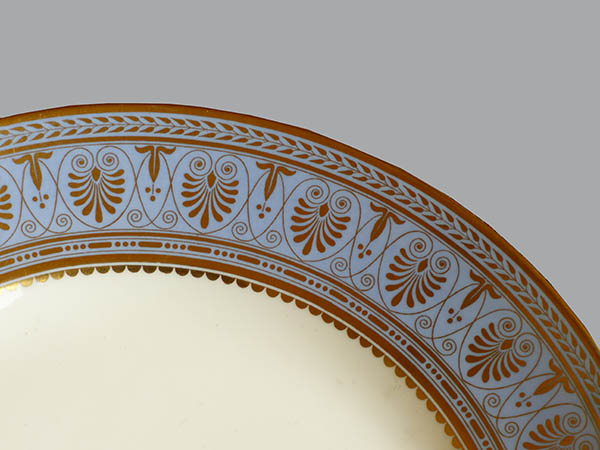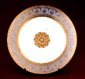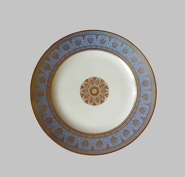 Vajilla circular de color blanco, el anverso presenta al borde una franja celeste amplia, con decoración en un diseño de palmetas, roleos y hojas de laurel de color dorado; al centro tiene un medallón con un elemento vegetal estilizado de color dorado. Plato llano modelo Agata azul con palmas (parte de un juego de vajilla de mas de 200 piezas). Porcelana policromada y dorada sobrecubierta