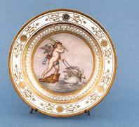 Recipiente circular, fondo blanco con decoración en borde de color dorado, floral y de círculos concéntricos. Al centro lleva un niño alado semi desnudo sobre una embarcación tirada por dos aves. Plato decorativo o de gabinete con escena: “Cupido transportado por dos cisnes”