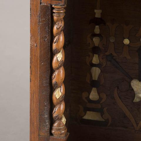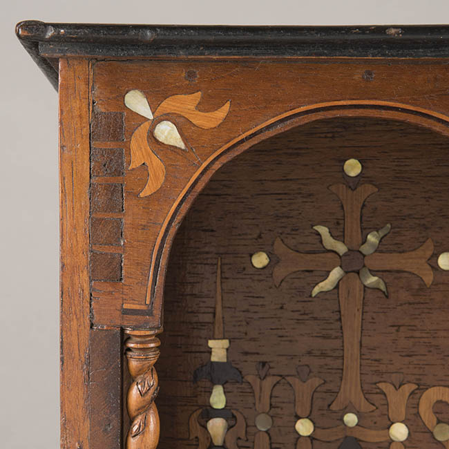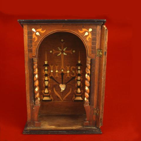 Mueble decorativo para culto de imagenes religiosas. Al extremo superior tiene un panel rectangular y parte frontal presenta un arco arco de medio punto y sostenido por columnas salomónicas. Por medio de la incrustación lleva al interior una cruz, dos candeleros, letras I.H.S y bajo éstas un corazón.