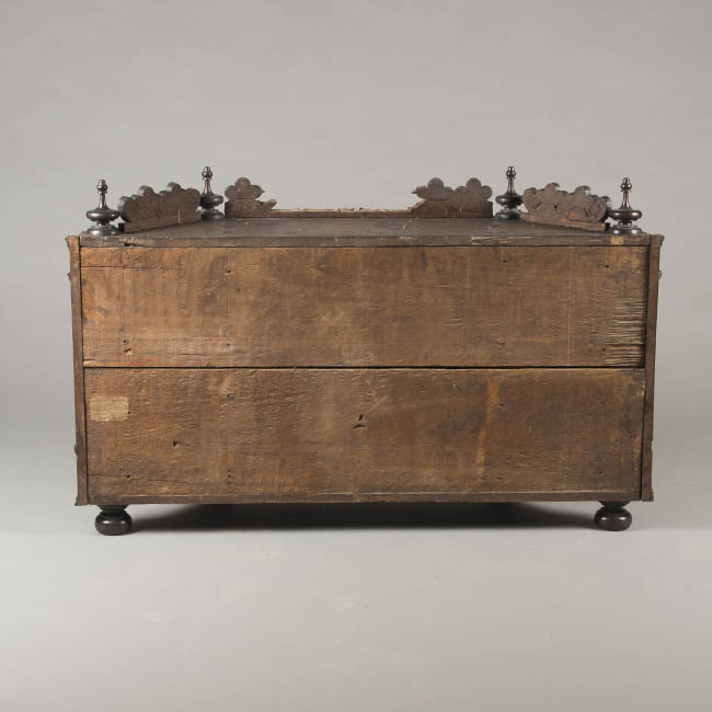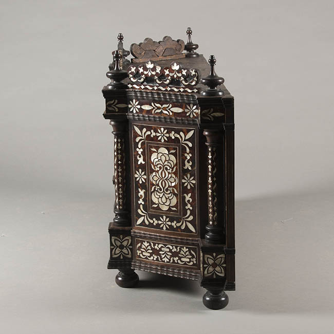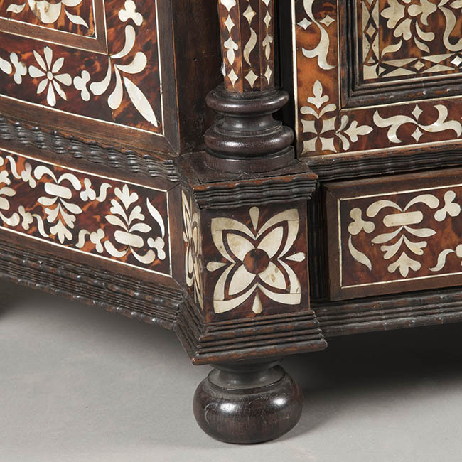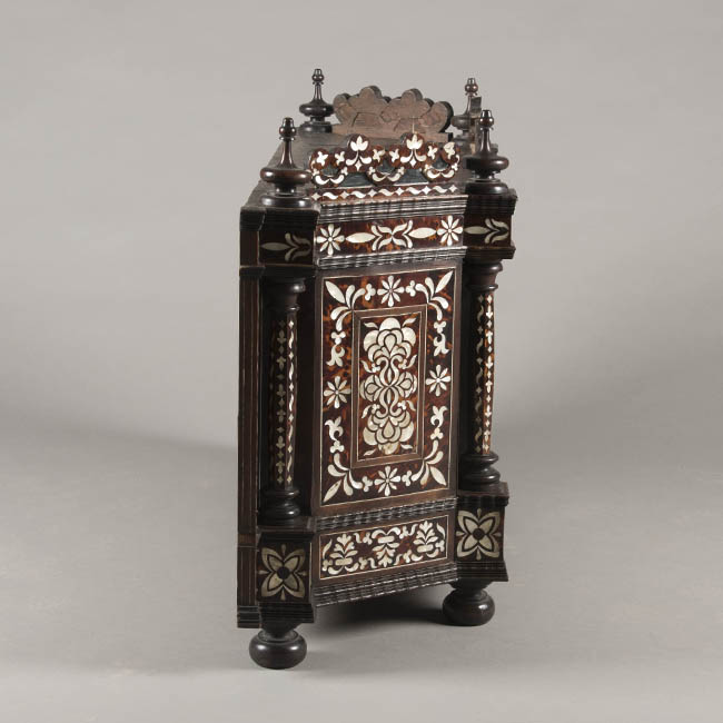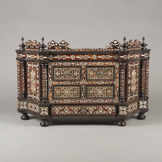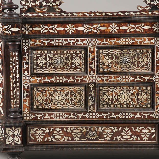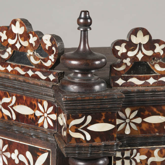 Mueble de guardar de forma trapezoidal. Realizado en madera ebonizada y decoración enconchada, con incrustación de nácar o madre perla y carey. Tiene molduras talladas en suaves ondas de influencia flamenca, patas de bola achatadas y adornos en la coronación de madera torneada. El cuerpo está formado por cuatro cajones centrales, dos superiores con tiradores e igualmente decorados con incrustaciones y dos inferiores con bocallaves. Un cajón inferior de todo el ancho con tirador. La coronación central tiene la misma ornamentación del resto del mueble con flores y hojas e incorpora cuatro espejos redondos.