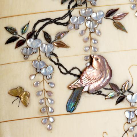 Es una pequeña caja de uso masculino anidada con 5 secciones que encajan entre sí a través de un rebaje y unidas a través de un cordón que se anuda en la base. En uno de los extremos lleva una pequeña esfera llamada ojime, decorada con rostros antropomorfos con diferentes expresiones en relieve y del cual pende una pequeña figurilla, llamada netsuke que representa a una anciana que se apoya en un cántaro y lleva un abanico. Las secciones están decoradas con incrustaciones de madre perla de variados colores, cuelgas con flor de la pluma (glicina), peonías, un pájaro y una mariposa.