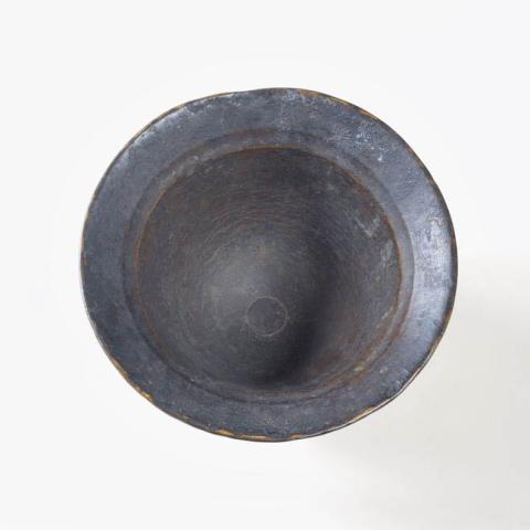 Utensilio metálico usado para triturar, es un volumen trapezoidal de color marrón oscuro. Al extremo superior presenta una abertura circular amplia, el borde es divergente y tiene una convidad interior; las paredes son rectas y convergen al extremo inferior, éste tiene un menor diámetro; la base es circular y plana. Presenta decoración en relieve, ubicada en la zona media del cuerpo.