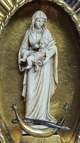 Objeto de devoción cristiana. Hornacina de bronce con forma ovalada rodeada por un destello de gloria, rematada en el extremo superior por una cruz breve. Al interior destaca una talla en marfil de bulto de una Inmaculada, representada de pie con el Niño en brazos. Esta parada sobre una media luna que en sus extremos lleva estrellas a cada lado y la serpiente a sus pies.