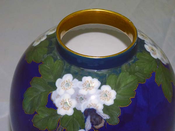 Objeto de uso doméstico y decorativo. Contenedor de cuerpo globular y boca restringida cubierta con una tapa de contorno redondeado que continúa el diseño. Sobre un fondo moteado de color azul, está decorado en el tercio superior con ramas de hojas verdes y conjuntos de flores blancas, sobre una de las cuales esta posado un abejorro marrón y anaranjado representado de forma muy natural. Los contornos de las figuras están punteados en dorado y su superficie es altamente brillante por el esmalte. Este recipiente con tapa para mantener flores fue diseñado en 1911 por J. Jacobsen.
