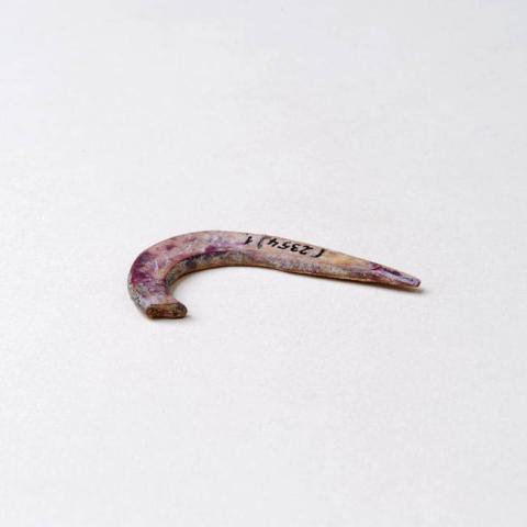 Anzuelo elaborado en concha. Forma cilíndrica similar a la letra "J", caras planas, vástago largo muy aguzado en el extremo, superficie de una de las caras pulida. Corte transversal rectangular. Uso en actividades de pesca. Color beige y púrpura.