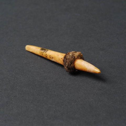 Entero, de forma cilíndrico cónico, un extremo aguzado y el otro le falta un pequeño fragmento. Presenta un sector de una cara plana. En la parte mas ancha de la pieza cerca de un extremo una amarra circunvalar con hilo fino de color cafe oscuro. Presenta estrías transversales en todo el cuerpo, superficie pulida. Corte transversal circular