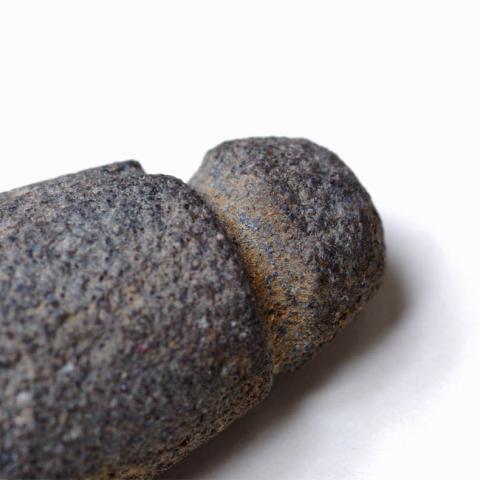 Parte proximal. Objeto de cuerpo fusiforme, un extremo más delgado, romo y con una cintura que rodea parcialmente el cuerpo y el otro extremo recto (quebrado), corte transversal ovoidal.