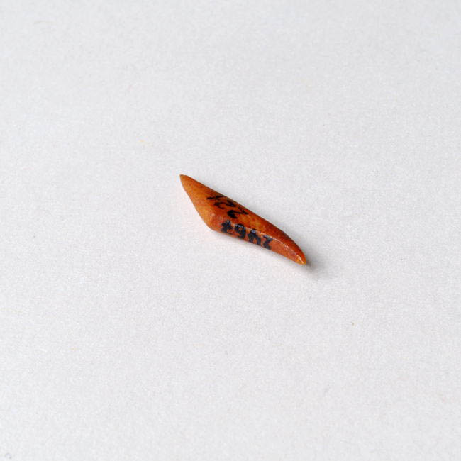 Componente de anzuelo compuesto. Objeto de forma alargada irregular de sección plana, ligeramente curvo, con ambos extremos apuntados y el sector central más ancho. Está fabricado en hueso tallado y pulido de color marrón claro.