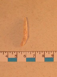 fragmento semi curvo de vástago largo de anzuelo de concha, caras irregulares, corte transversal rectangular
