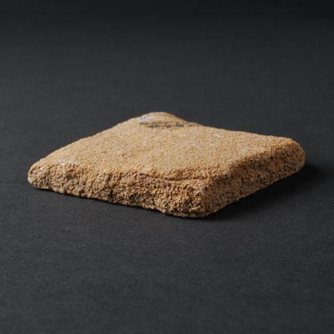 Cuerpo plano, de forma cuadrada, bordes laterales rectos, uno de ellos levemente aserrado y desgastado en diagonal.