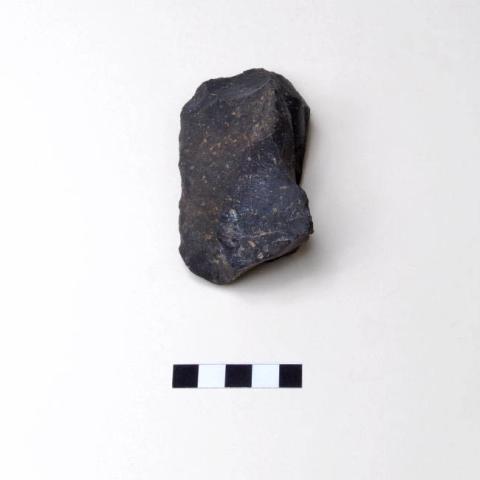 Cuerpo de forma rectagular. Un extremo en punta por golpes de lascado en el costado, el otro extremo y costado son rectos. Caras planas y convexa.