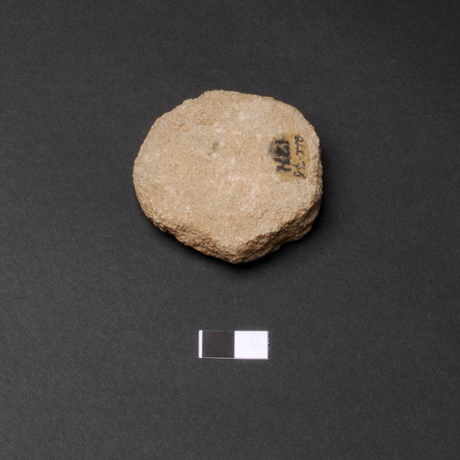 Objeto de de forma discoidal, con ambas caras planas y una rugosa, bordes rectos irregulares. Está fabricado en piedra tallada rústicamente de color marrón.