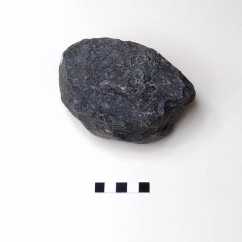Cuerpo de forma ovoidal irregular, ambas caras planas, un lado recto. Un extremo romo el otro leve redondeado, superficie con algunos golpes de percusión.