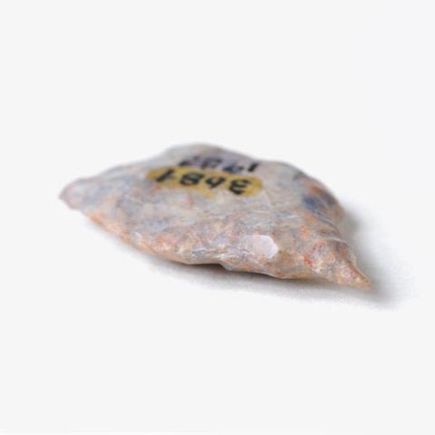 Instrumento usado para perforar. Tiene forma triangular irregular con el extremo distal apuntado, hombros triangulares y base plana. Se trata de una punta de proyectil reacondicionada para un nuevo uso. Piedra tallada de color gris claro.