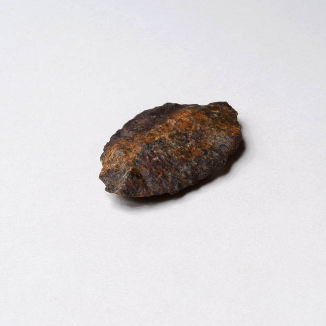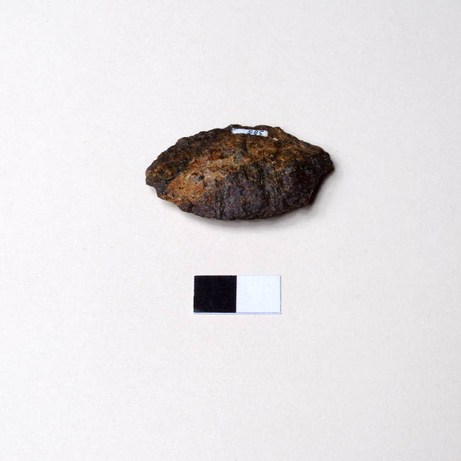 Objeto lítico, entero, de forma elipsoidal con lados convexos, retoque bifacial y bimarginal doble. color negro veteado amarillo.
