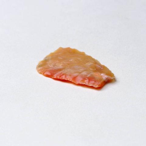 Forma triangular osósceles, base recta con bordes redondeados, un lado recto el otro leve convexo, caras convexas. Con retoques bifaciales y bimarginal. Quebrada falta extremo distal (vertice).