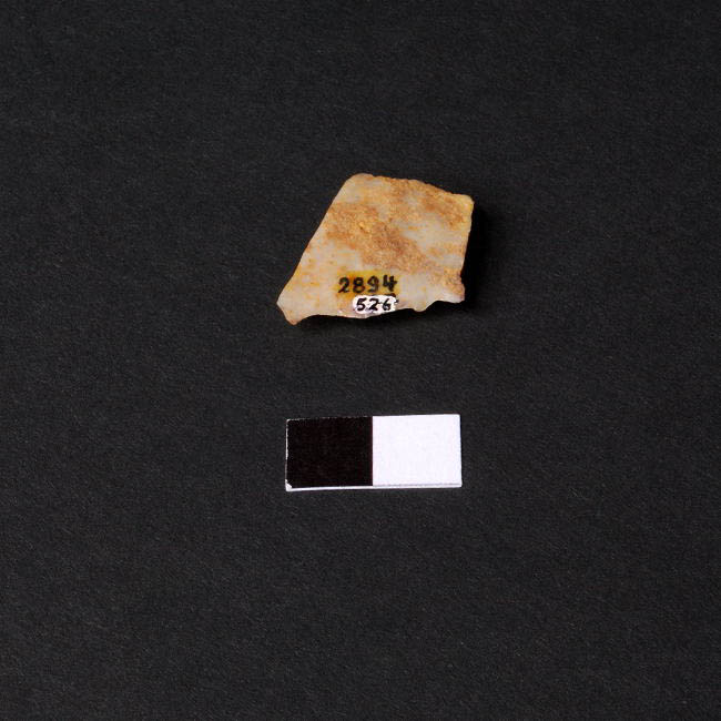 Objeto lítico quebrado. Forma romboidal, lados rectos punta y base quebradas, lascado monofacial, posible retoque mono marginal. Color gris suave veteado crema.