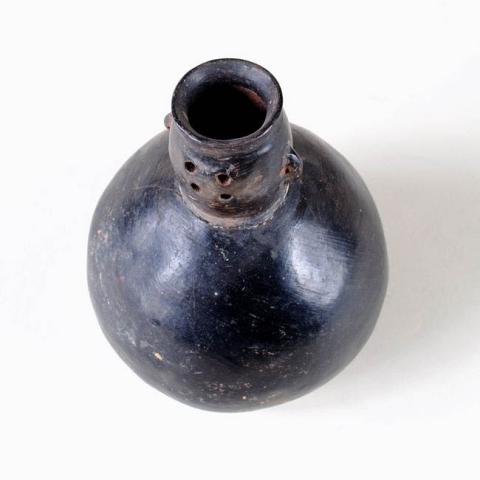 Forma globular, antropomorfo tipo negro bruñido, Fase Quitor (400- 700 dC). Base plana , cuerpo globular, cuello leve ensanchado con dos pequeñas orejas a los costados. Rostro hecho con perforaciones en dos caras del cuello (Anterior y posterior)