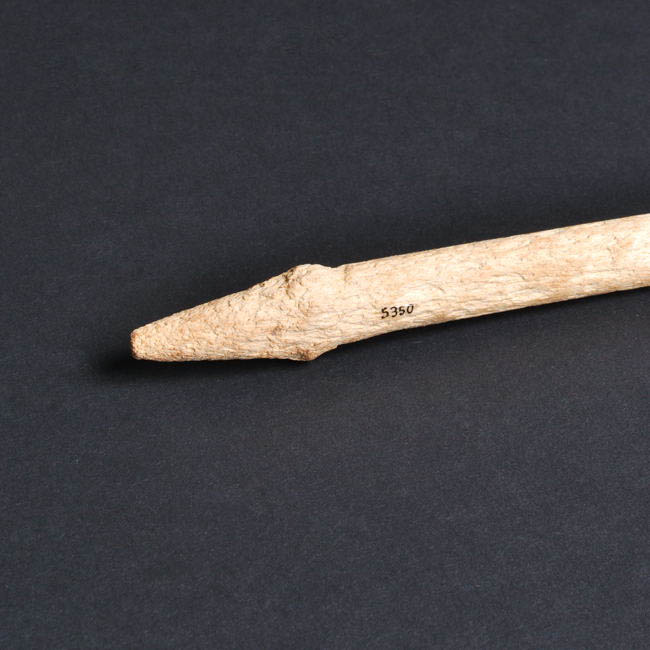 Quebrado longitudinalmente, forma cilindrica levemente curvo, un extremo aguzado y manchado con rojo en superficie